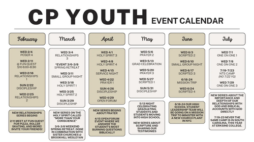 This semester CP Youth is also doing a discipleship group on the last sunday of each month following the 11am service (12:45-3pm). This is an opportunity for students who are serious about following the Lord to go deeper and have more opportunities to learn how to share their faith.